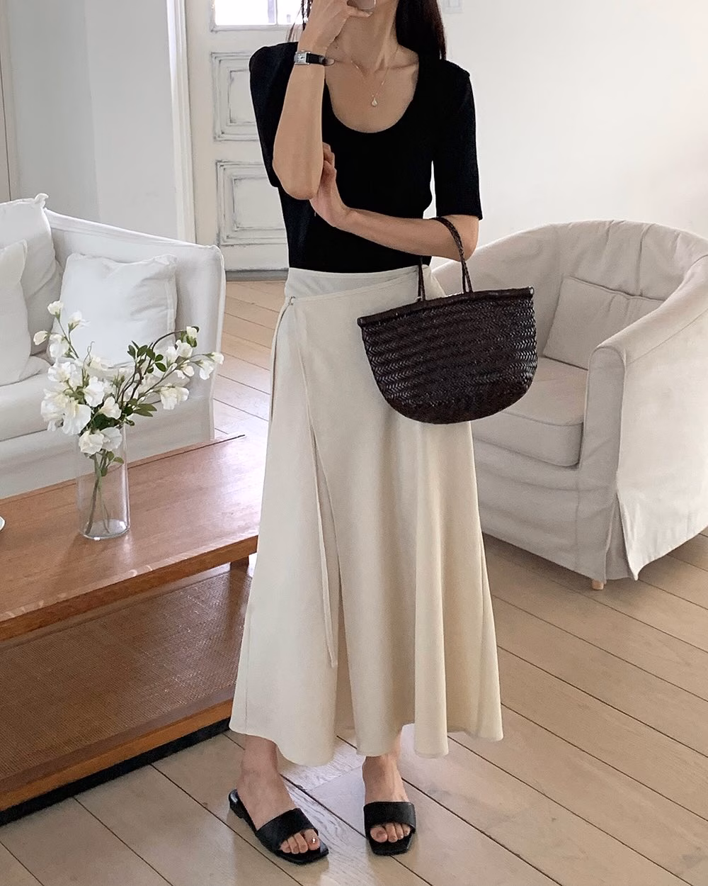 Chân váy xẻ tà là lựa chọn lý tưởng khi muốn làm mới phong cách công sở mà vẫn giữ được sự tinh tế. Phần xẻ tà là chi tiết nhỏ nhưng có sức mạnh lớn trong việc tăng sự cuốn hút cho tổng thể trang phục. Không chỉ giúp bộ đồ trông thời thượng hơn, chân váy xẻ tà còn ‘ăn gian’ chiều cao hiệu quả, đặc biệt khi kết hợp cùng giày cao gót kiểu mule hoặc sandal quai mảnh. Đây là kiểu chân váy lý tưởng để chuyển từ mùa hè sang thu vì vẫn giữ được sự thoải mái nhưng có thêm điểm nhấn đầy cuốn hút.