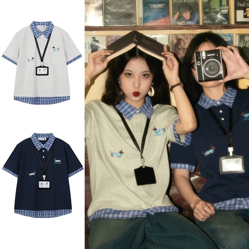 🔥 Youtang Mỹ retro họa tiết chó con thêu kẻ sọc áo sơ mi POLO mùa hè dáng rộng nam nữ cotton nguyên chất đang giảm giá!