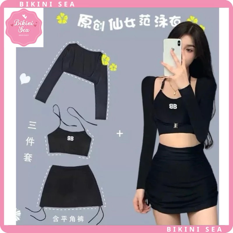 🔥 Bikini đồ bơi 3 mảnh hot trend áo yếm cột dây chân váy rút dây có quần trong kèm áo croptop dài tay fresize đang giảm giá!