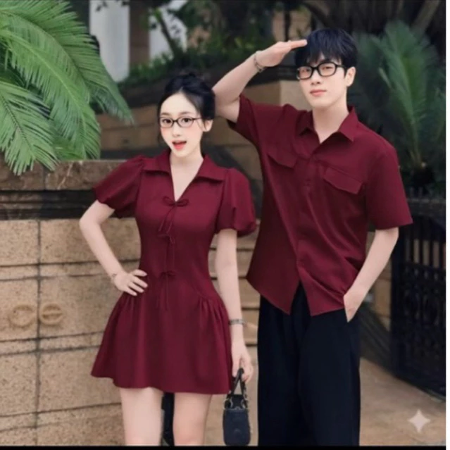 🔥 (nữ max 90kg nam max 110kg) Set đồ đôi đi tiệc đỏ mận cotton lạnh tay bồng đính nơ dễ thương – FOREVER COUPLE đang giảm giá!