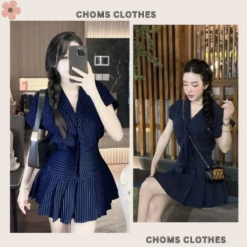 Một trong những lựa chọn hiện đang được quan tâm trên thị trường là Sét đồ nữ váy đầm nữ dự tiệc cưới váy ngắn cổ cà vạt sét kẻ xanh than của Chomss DESIGN. Chiếc đầm này có các đặc điểm sau: