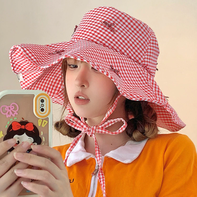 Khám Phá Mũ Phong Cách Hàn Quốc Nơ Đỏ Kiểm Tra Tether Nón Nữ Du Lịch Mùa Hè Vành Lớn Che Nắng Mũ Chống Nắng