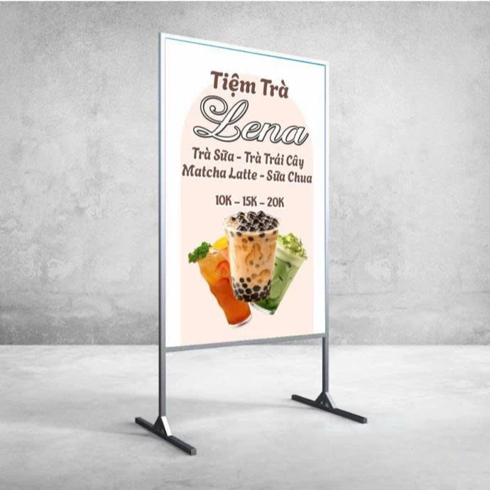 Với thiết kế 2 mặt, bảng hiệu trà sữa này có thể được đặt ở nhiều vị trí khác nhau, giúp tăng khả năng thu hút khách hàng.